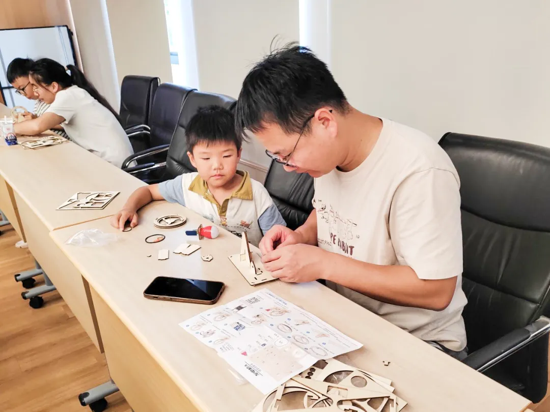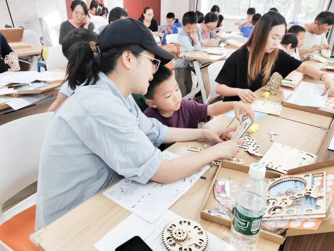 手工课上,亲子家庭共同组装电动过山车、手摇发电机,在趣味互动中播种科学探索的种子。